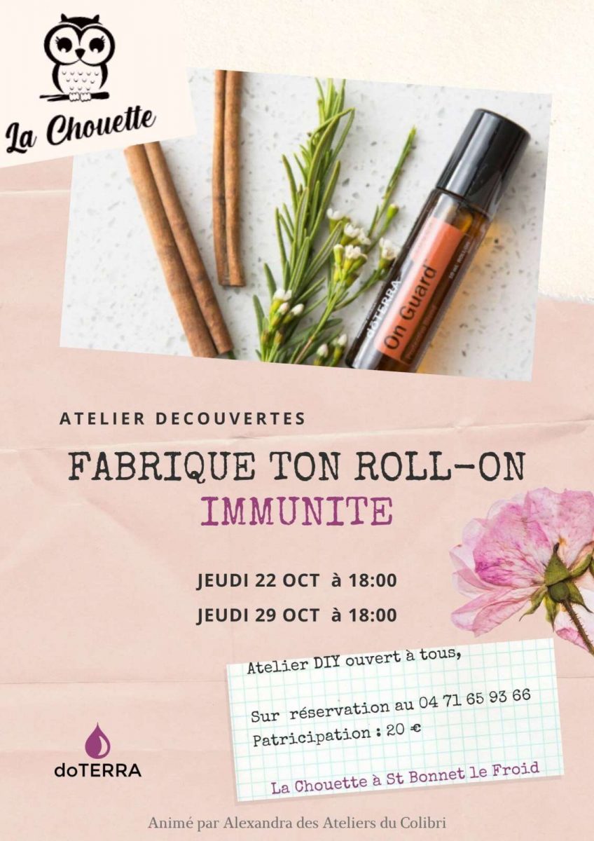 • Jeudi 22/10 – 18h00 . La Chouette St Bonnet-le Froid- Atelier découverte des huiles essentielles doTERRA, fabrication roll-on spécial immunité